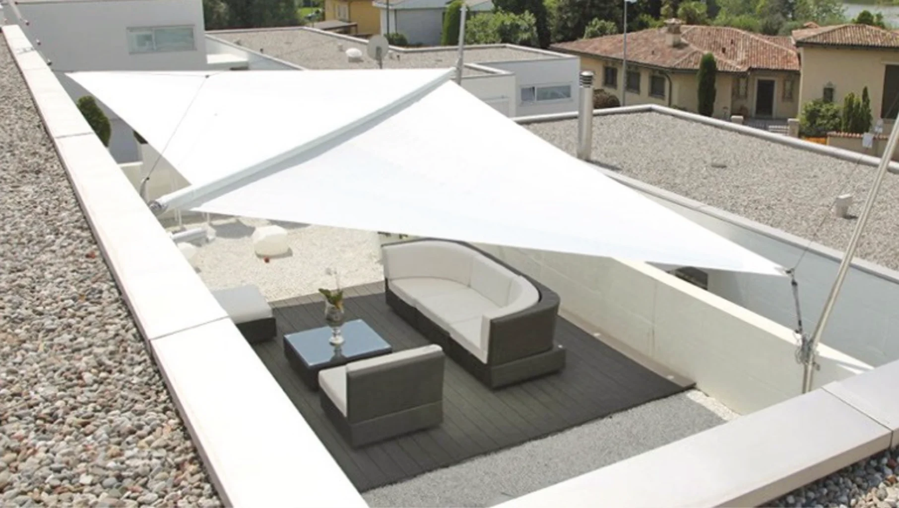 Das SOLIDAY-CS bietet im Vergleich zu herkömmlichen Markisen eine außergewöhnlich große Flächenbeschattung mit vollautomatischem Funkbedienungs-Comfort. SOLIDAY-CS wird über eine horizontale, motorgetriebene Welle an der Gebäudewand wie eine Markise aufgerollt. Über eine neuartige, patentierte Systemlösung wird das Segel auf Knopfdruck bis zu 7 m automatisch ausgezogen. Dabei kann das Segel eine dreieckige Form mit einem Masten oder eine viereckige Form mit zwei Masten aufweisen – je nach Wunsch waagrecht oder geneigt gespannt. Dieses neuartige Segelkonzept für Sonnen- und Regenschutz eröffnet gänzlich neue gestalterische Dimensionen – ein architektonisches Highlight für die coolen Stunden des Sommers.